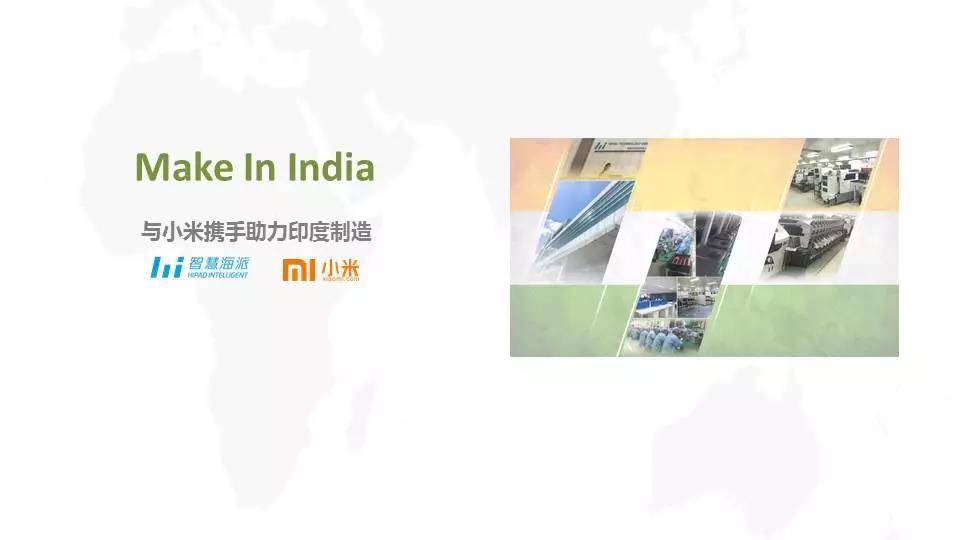 2018年4月9日至11日,小米在印度召開了首屆印度供應商大會。小米副總裁張峰,副總裁兼小米印度總經理Manu Kumar Jain,印度商業與工業部部長Suresh Prabhu,印度信息技術部部長Ravi Shankar Prasad等其他印度主要官員,及包括智慧海派在內的全球50多家供應商出席本次大會,就如何與政府合作,在印度市場建立生態鏈制造系統進行了深入的探討。