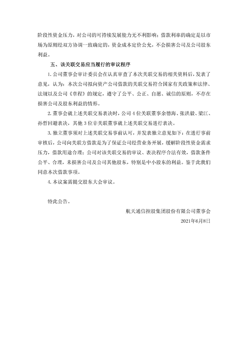 航天通信控股集團(tuán)股份有限公司關(guān)于擬向航天科工資產(chǎn)管理有限公司借款的關(guān)聯(lián)交易公告