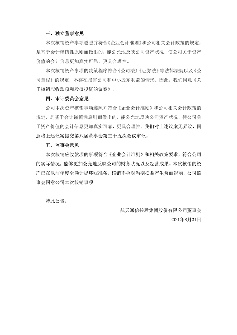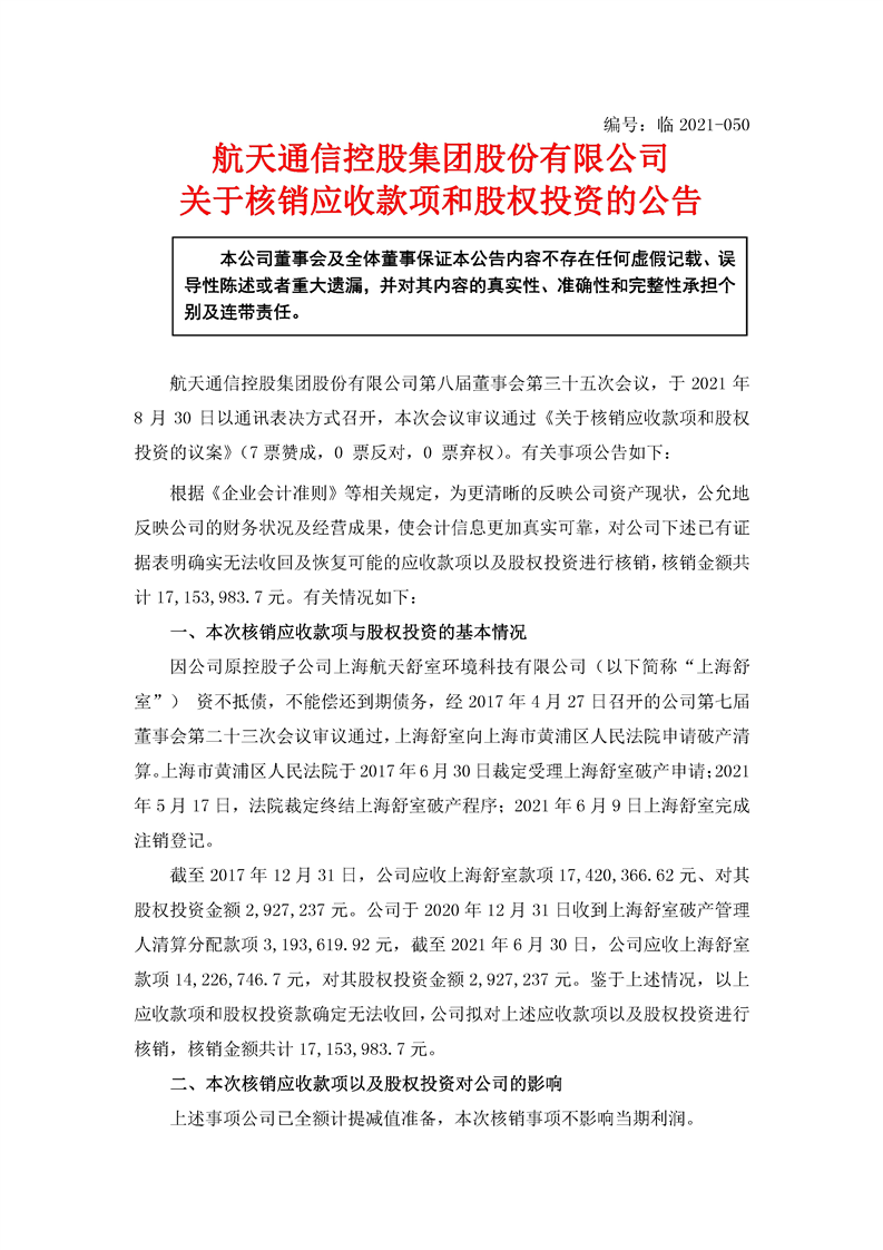 航天通信控股集團股份有限公司關(guān)于核銷應(yīng)收款項和股權(quán)投資的公告